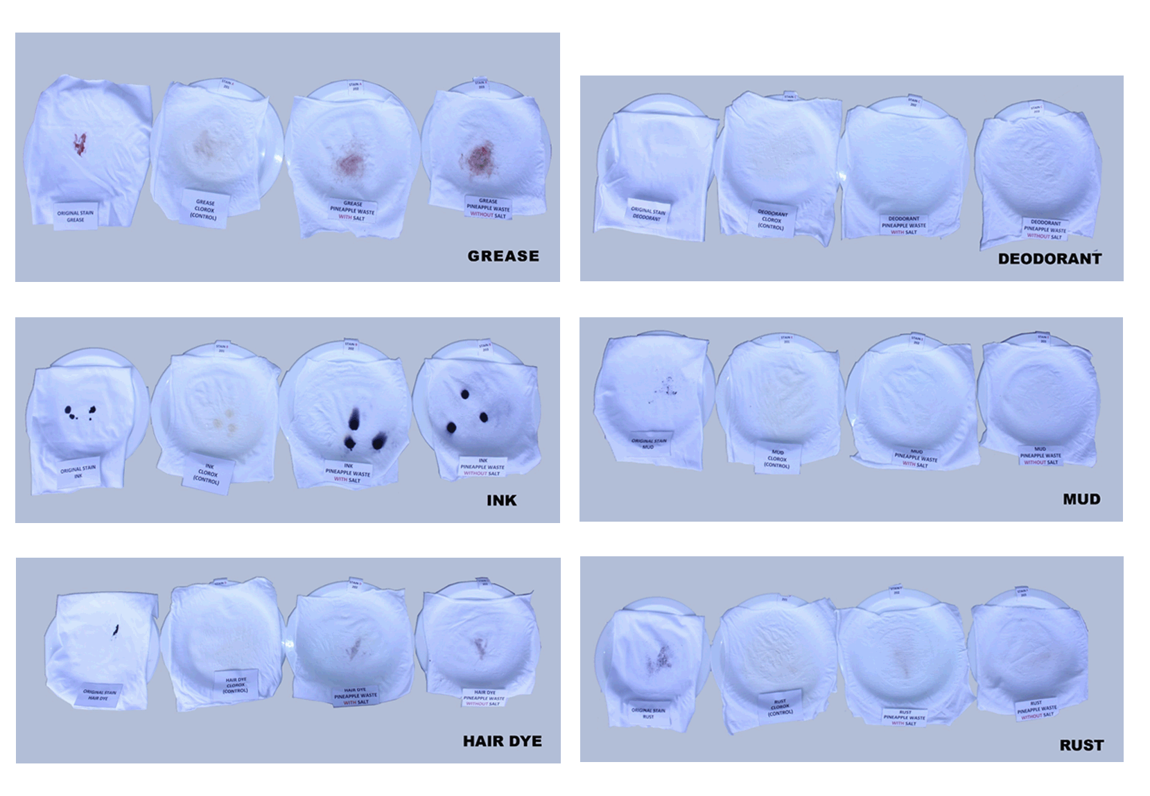 This study involves the determination of the effect of pineapple (Ananas comosus) peel extract, (with and without salt), on fabrics stained with grease, ink, hair dye, deodorant, mud,and rust. An 8" X 9" cotton white c...